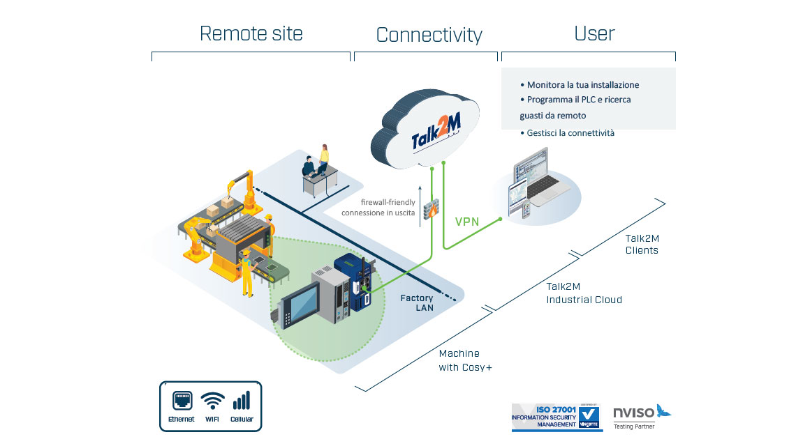 Grazie al chip di sicurezza hardware integrato e all'aggiornamento dei protocolli di autenticazione e crittografia, Cosy+ fornisce lo stato dell'arte della sicurezza per gli accessi remoti "end-to-end" ai dispositivi di automazione tramite il servizio cloud Talk2M.