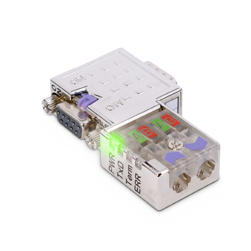 I connettori per Profibus ed MPI EasyConn prodotti da VIPA, forniscono tutte le funzioni di test che velocizzano la connessione e la diagnostica. Quattro LED, visibili entrambi i lati, indicano lo stato del bus e del nodo: il LED verde PWR mostra l'alimentazione del nodo, il secondo LED verde TxD la presenza di comunicazione, il terzo LED verde Term informa se la resistenza di terminazione è inserita oppure no, il quarto LED rosso ERR indica se c'è una resistenza di terminazione sbagliata o una errata impedenza che influenzza il bus transfer. Il connettore EasyConn con Controller integrato funziona con tutte le velocità fino a 12 Mbaud. Grande vantaggio viene fornito agli utilizzatori in fase di montaggio ed avviamento della rete Profibus o MPI in quanto i LED di diagnostica indicano immediatamente gli eventuali problemi di connessione e/o l'inserimento delle resistenze di terminazione. Il rivestimento completamente in metallo assicura un'alta protezione dai disturbi. Le resistenze di terminazione sono attivabili con un interruttore scorrevole accessibile da entrambi i lati. In questo modo, si può testare la comunicazione Profibus senza aprire il connettore o rimuovere i cavi, i condotti dei cavi sono provvisti di copertura trasparente, in tal modo sono visibili il collegamento ed i cavetti del doppino. La connessione del doppino con cutting-clamps assicura una facile e sicura installazione anche in campo. Ogni parte del connettore è progettata con viti imperdibili, nessun pezzo sfuso!